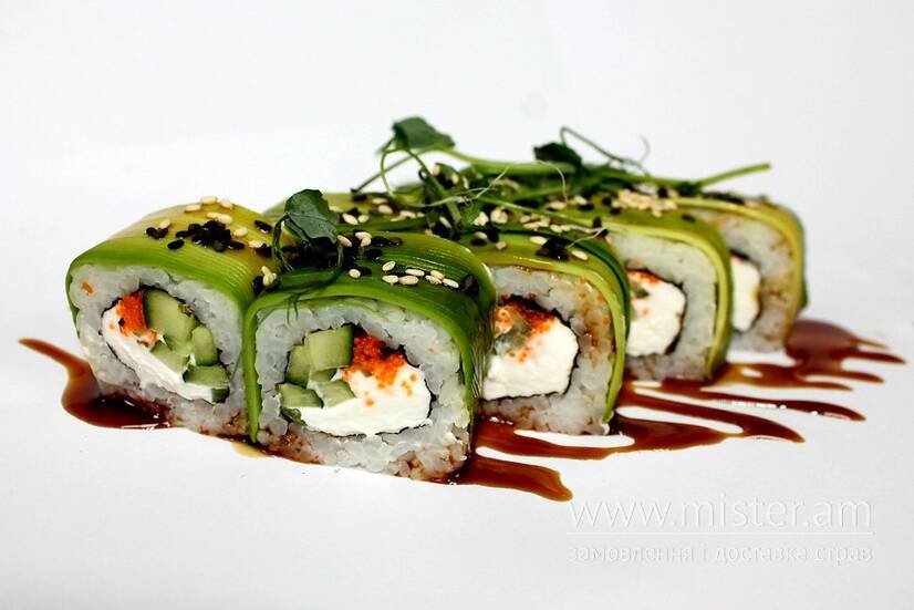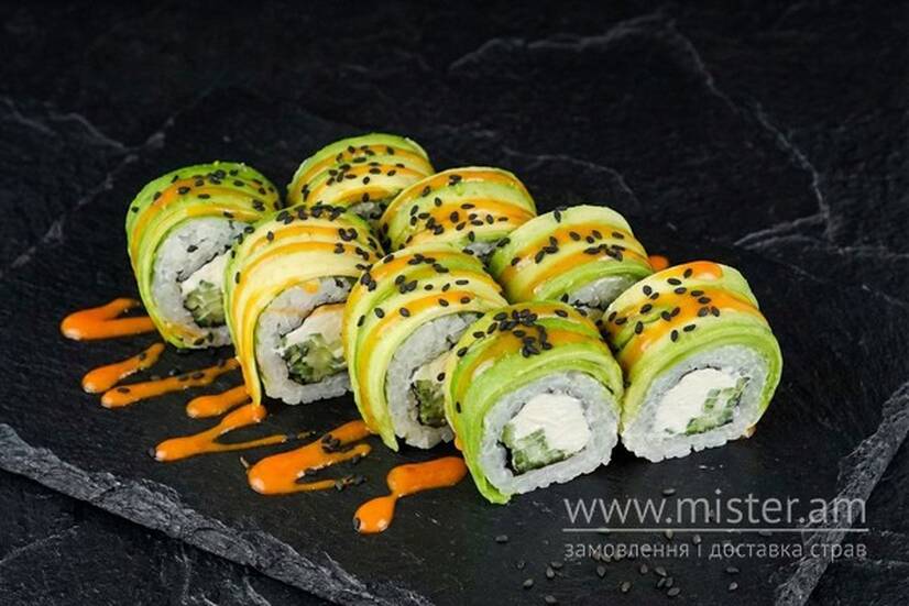 Рис, авокадо, ікра масаго, огірок, соус унагі, кунжут.