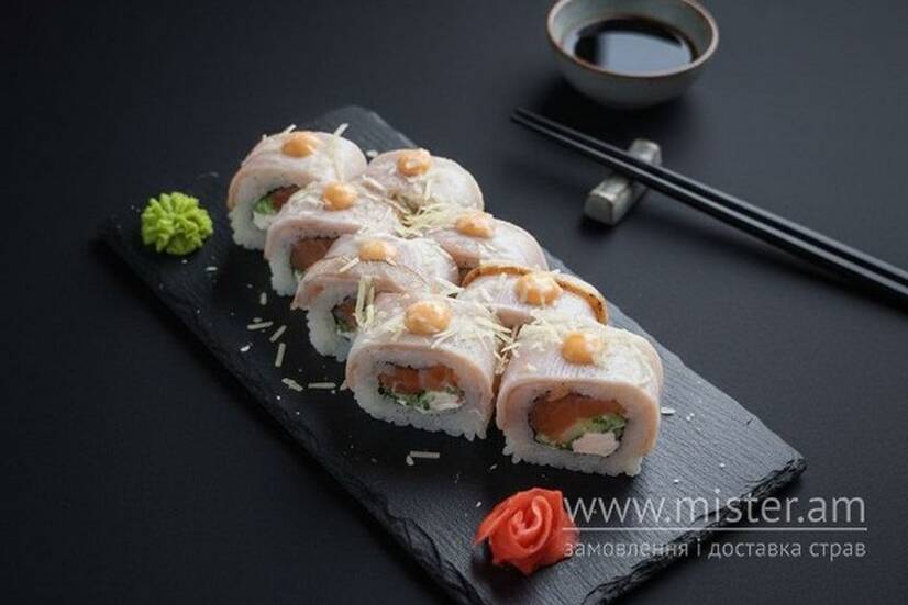 Бекон, сир Філадельфія, огірок, лосось, бекон, соус спайс, пармезан.