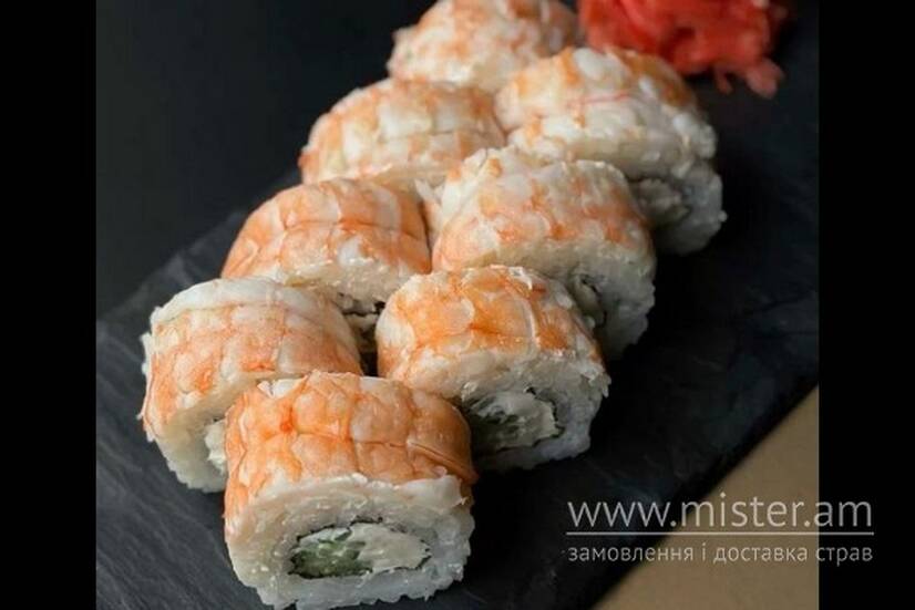 Тигрові креветки, ікра масаго, огірок, авокадо, сир Філадельфія.