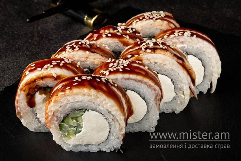 Рис, вугор, сир Філадельфія, огірок, соус унагі, кунжут.