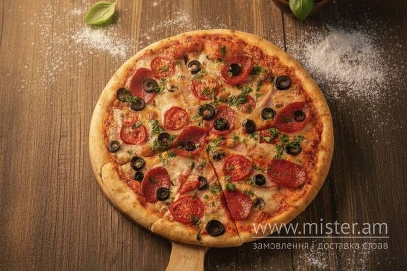 Салямі, бекон, гриби, помідор, маслини, моцарела, соус червоний.