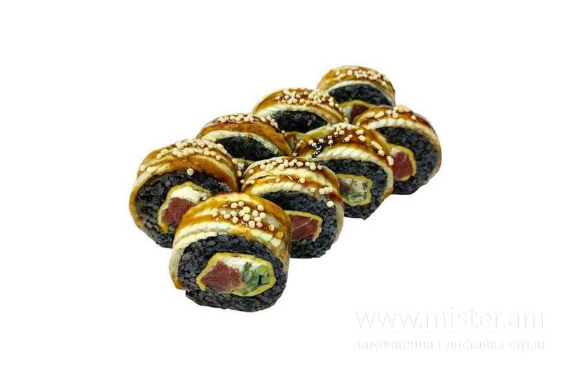 Чорнило каракатиці, вугор, тунець, сир Філадельфія, огірок, сир тостовий, соус унагі, рисові кульки.