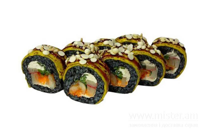 Чорнило каракатиці, сир тостовий гриль, креветки тигрові варені, сніжний краб, сир Філадельфія, ікра масаго, огірок, соус унагі, глазур.