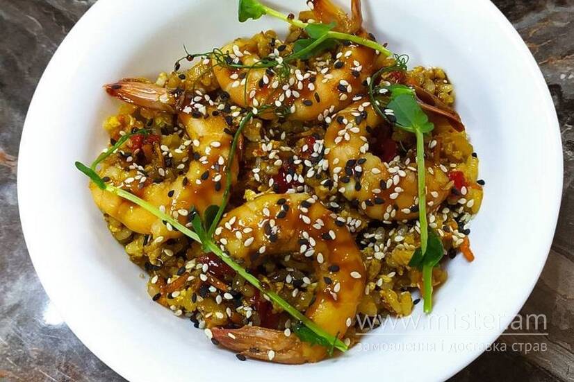 Рис, креветки 4 шт., морква, цибуля ріпчаста, перець болгарський, кунжут, соус унагі.