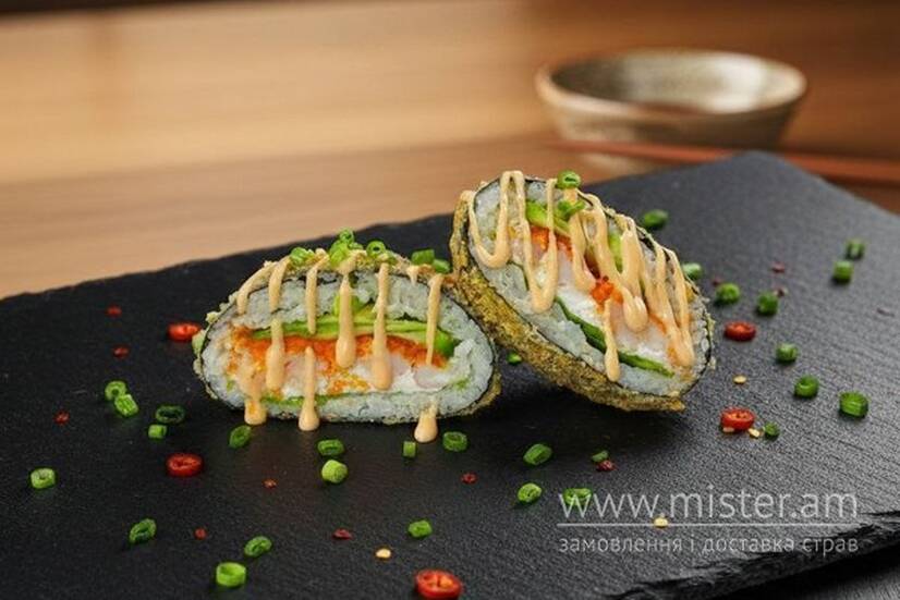 Тигрові креветки варені, лист салата, ікра масаго, авокадо, сир Філадельфія, соус спайс, сухарі панко, темпура.