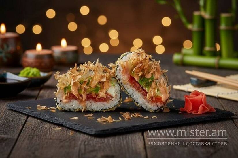 Тунець, ікра масаго, лист салата,авокадо, сир Філадельфія, соус спайс, сухарі панко, темпура.