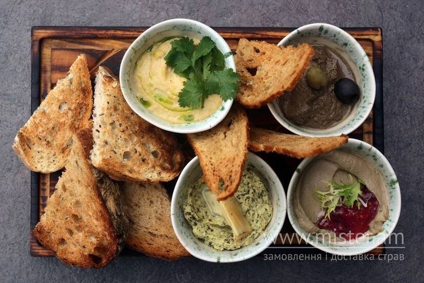 Хумус, оливкова тапената, крем з копченого сиру, паштет із курячої печінки, грінки.