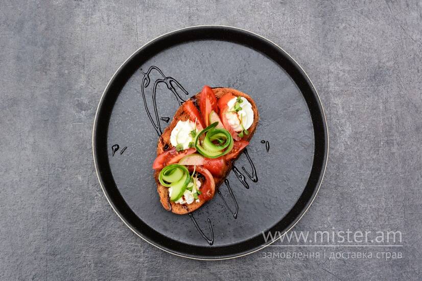 Крем-сир, томати чері, соус унагі, каперси, огірок.