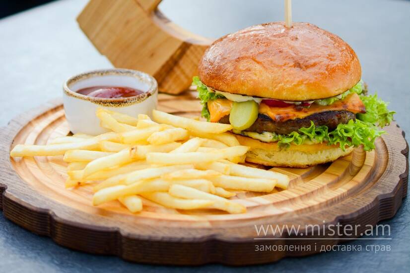 Смеш котлета, сир чедер, маринована цибуля, булочка бріош, корнішони, соус айолі, картопля фрі, кетчуп.