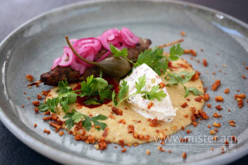 Крем-сир, джем з перцю, хумус, маринована цибуля, кінза.