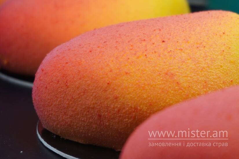 Манговий гель зі шматочками персика та розмарином, манговий ганаш, лаймовий бісквіт.