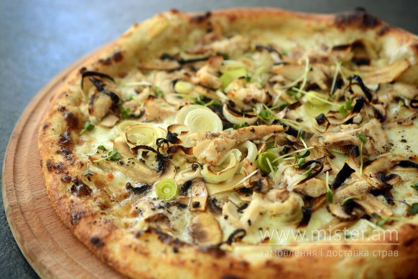 Моцарела, трюфельна олія, курка, печериці, цибуля-порей, вершково-трюфельний соус.