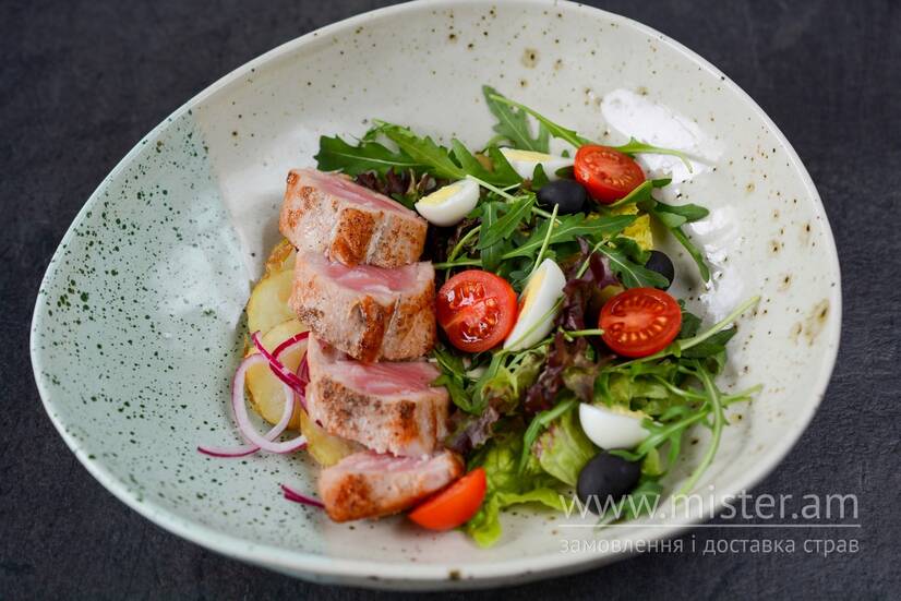 Мікс, чері, молода картопля, маслини, перепелині яйця, соус цезар.