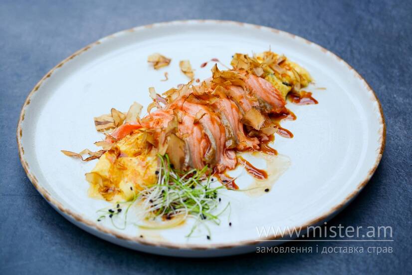 Лосось татакі, норі, кисло-солодкий соус, стружка тунця.