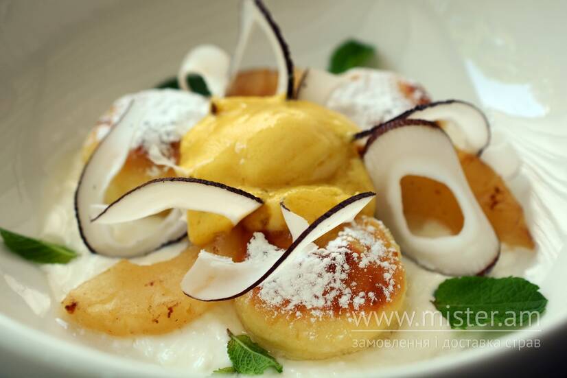 Кокосова сметана, карамелізований ананас, чіпси кокос, сорбет манго-маракуйя.