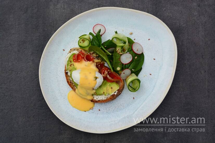 Яйце пашот, мікс насіння, авокадо, мікс салату з томатами та огірком, лосось с/с, голландез.