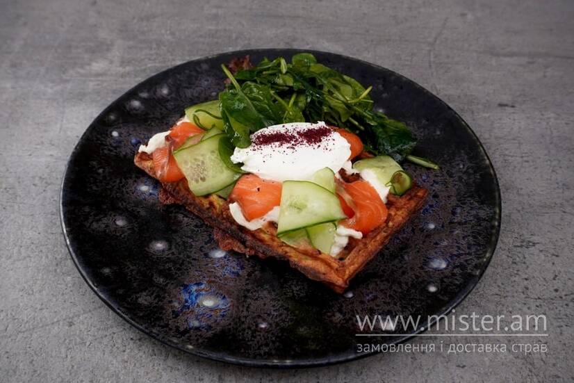 Яйце пашот, крем-сир, лосось с/с, огірок, мікс зелені, лимонний дресінг.