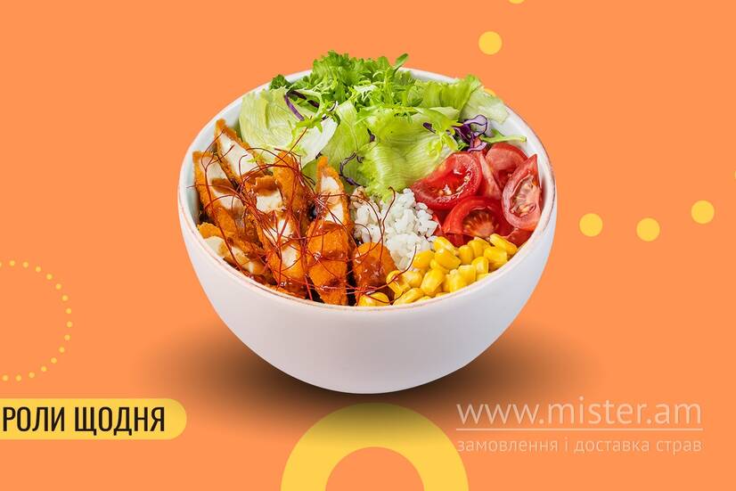 Рис, курячі стріпси, кукурудза, соус Тонкацу, мікс салату, соус Світ Чилі, соус Ланч Кінг, лимон, чилі нитка.