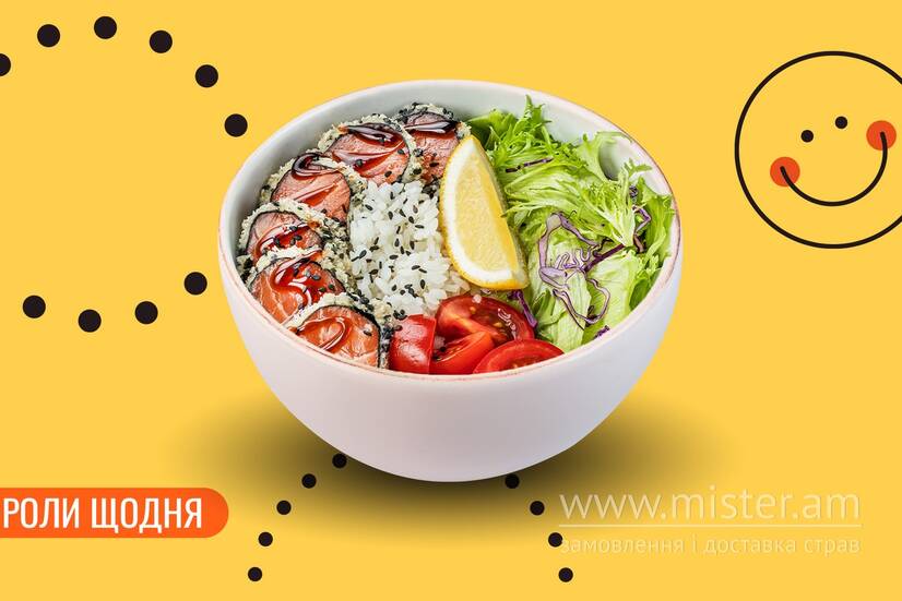 Рис, лосось, норі, кляр темпура, сухарі панко, мікс салату, помідор, соус Ланч Кінг, соус Горіховий, лимон, кунжут.