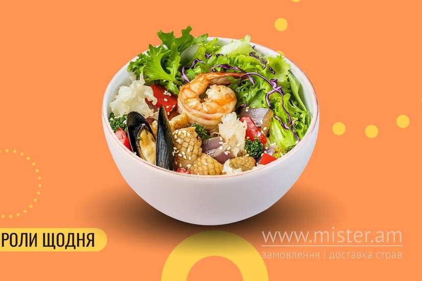Рис, бульйон курячий, креветки, мідії, кальмари, броколі, перець болгарський, цибуля синя, мікс салату, гриб кораловий, мікс імбир-часник, соус Блек Бін, соус Ланч Кінг, лимон, кунжут.