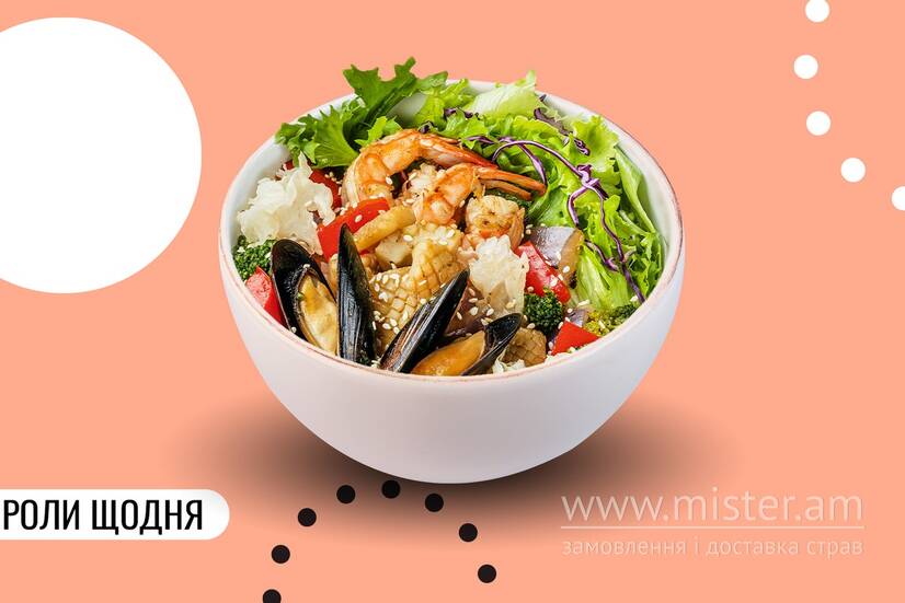 Рис, бульйон курячий, креветки, мідії, кальмари, броколі, перець болгарський, цибуля синя, мікс салату, гриб кораловий, мікс імбир-часник, соус Блек Бін, соус Ланч Кінг, лимон, кунжут.