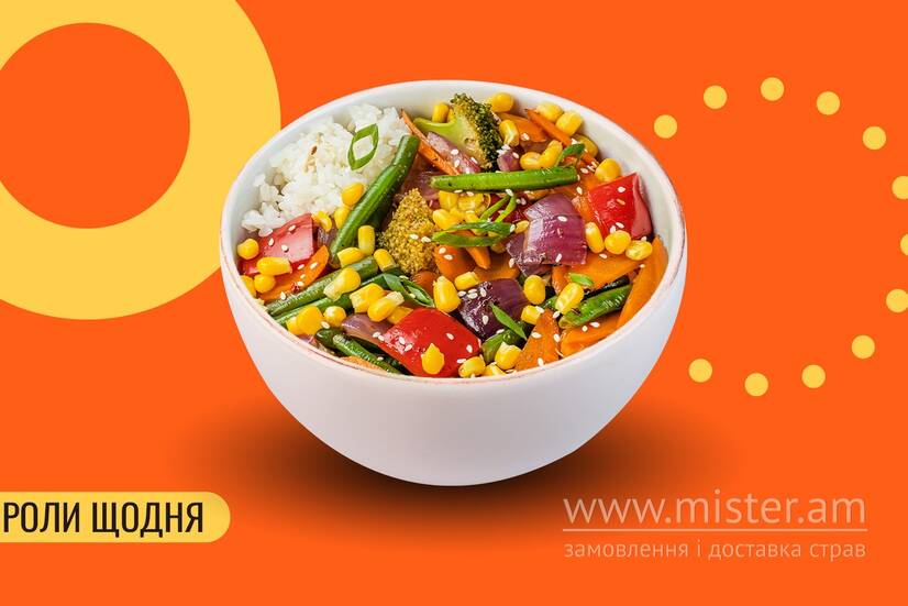 Рис, бульйон курячий, броколі, спаржа, перець болгарський, морква, цибуля синя, мікс імбир-часник, кукурудза, цибуля зелена, соус Пад Тай, кунжут.