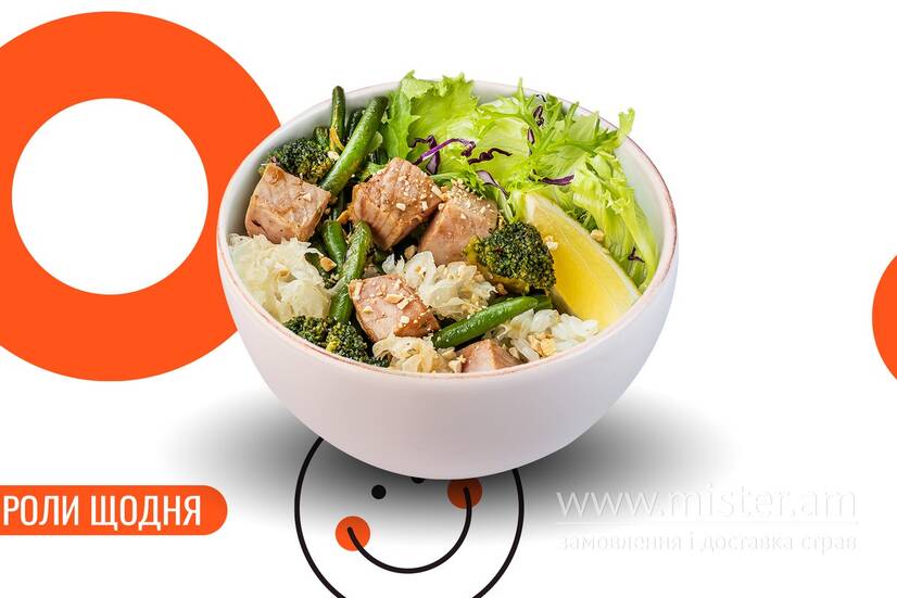Рис, бульйон курячий, тунець, спаржа, мікс салату, гриб кораловий, мікс імбир-часник, соус Пад Тай, соус Ланч Кінг, лимон, горіхи кешью.