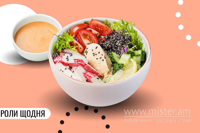 Крабові палички, кіноа, огірок, помідор, мікс салату, крем сир, соус Устричний, соус Азія BBQ, соус Ланч Кінг, соус Світ Чилі, лимон, кунжут.