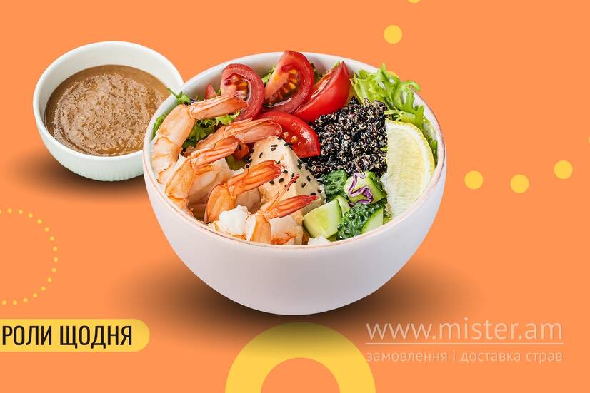Креветки, кіноа, огірок, помідор, мікс салату, крем сир, соус Устричний, соус Азія BBQ, соус Ланч Кінг, соус Горіховий, лимон, кунжут.