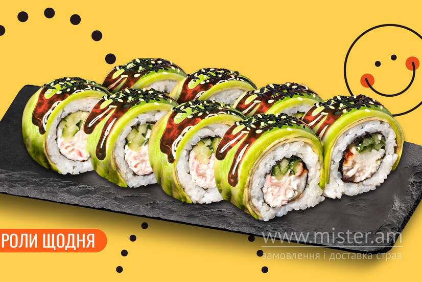 Рис, огірок, вугор, авокадо, крабовий мікс, соус унагі, норі, кунжут.