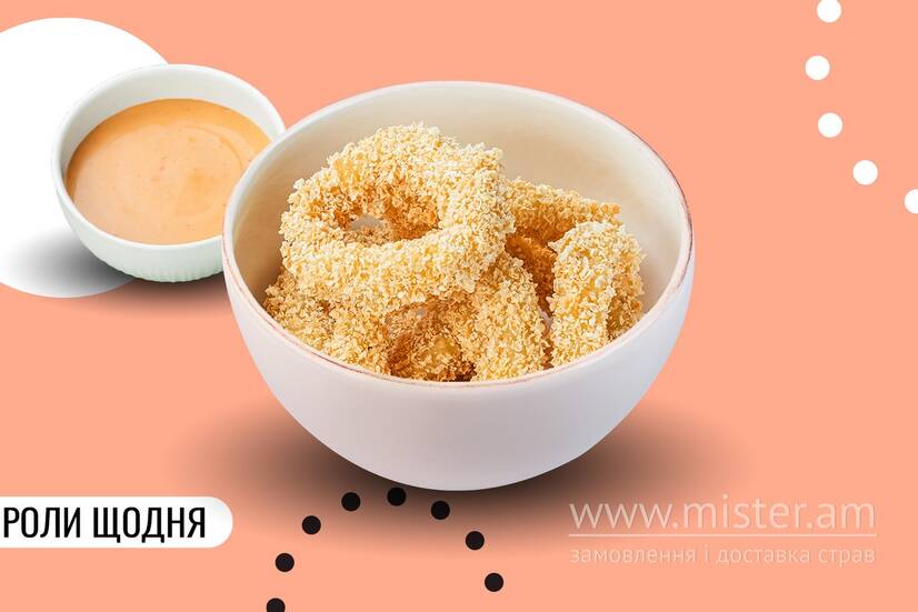 Кальмар, кляр темпура, сухарі панко, борошно темпура, соус Світ Чилі.