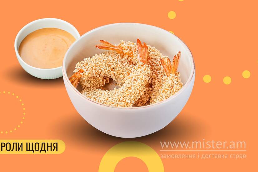 Креветка, кляр темпура, сухарі панко, борошно темпура, соус Світ Чилі.