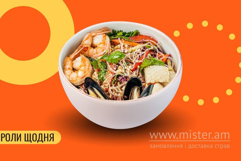 Локшина рисова, кальмари, креветки, мідії, огірок, морква, капуста синя, перець болгарський, кінза, соус для рисової локшини (олія, часник, соус Понзу, соус Пад Тай, кунжут), цибуля зелена, горіхи кешью.