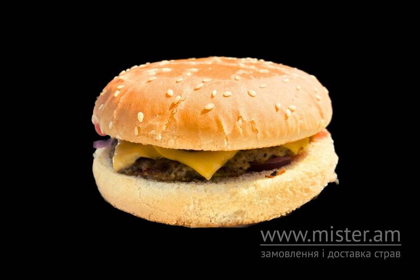 Булочка, котлета з яловичини, червона цибулька, солений огірок, сир Чедер.