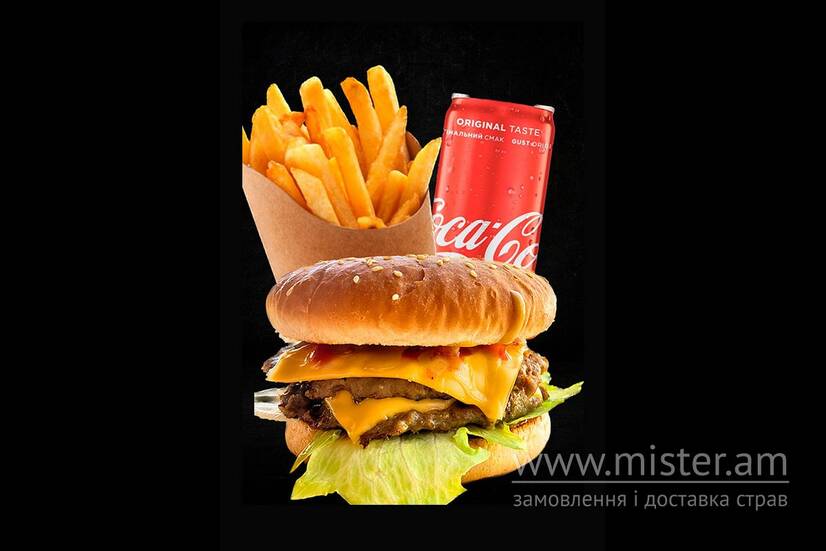 Булочка, подвійна котлетка з яловичини, червона цибулька,помідор, салат,сир Чедар. Картопля фрі та Кока-кола.