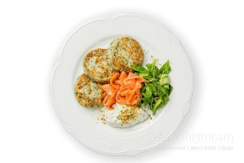 Сирники зі шпинатом, лосось слабосолений, огірок, шпинат, фісташка.