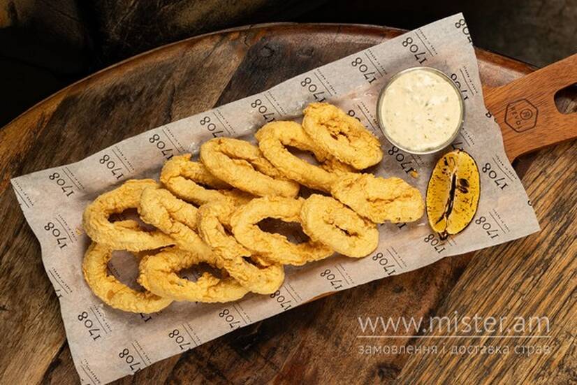 Кальмари фрі — ніжні кальмари, обсмажені до золотистої скоринки, подані гарячими з долькою лимона.