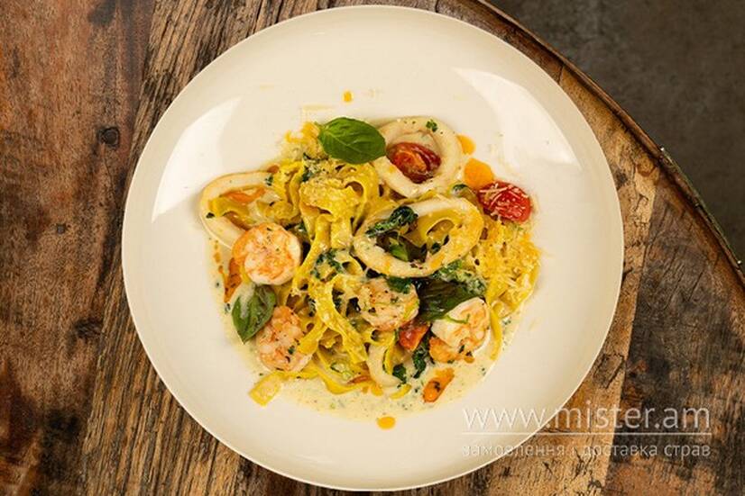Апетитна комбінація пасти фетучіні у поєднанні з обсмаженими креветками, кальмарами, свіжим шпинатом та помідорами чері. Пасту тушкуємо у фірмовому соусі з нотками солодкого чилі, тим'яну та ароматом часнику. До пасти додаємо пармезан. Декоруємо листям базиліку.