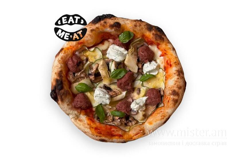 Наша фірмова піца з неаполітанського тіста, змащена соусом сальса, на яке викладаємо ніжну моцарелу та суперболи Eat me at* з цукіні, печерицями та артишоками. Додаємо базиліковий соус та декоруємо листям базиліку.