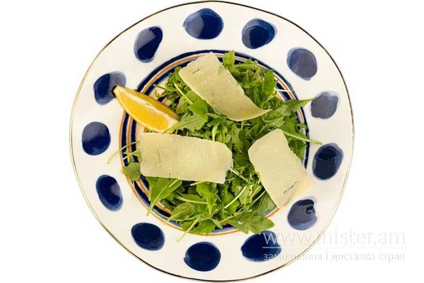 Легкий та ароматний салат зі свіжої руколи та тертого пармезану, заправлений оливковою олією з додаванням краплини лимонного соку.