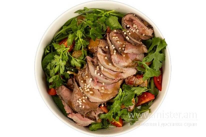Соковитий ростбіф на міксі салату з томатами черрі, болгарським перцем, запеченими цукіні та баклажанами, заправленими медово-соєвим соусом. Декоруємо кінзою та хрусткими рисовими кульками.