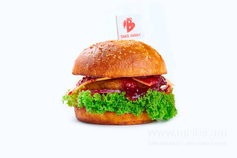 Cвиняча котлета, салат айсберг, помідор,червона цибуля, сир тостовий, фірмовий соус, ягідний соус.