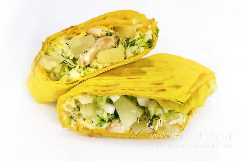 Лаваш, курка, ананас консервований, пекінська капуста, сир моцарела, фірмовий соус, зелень.