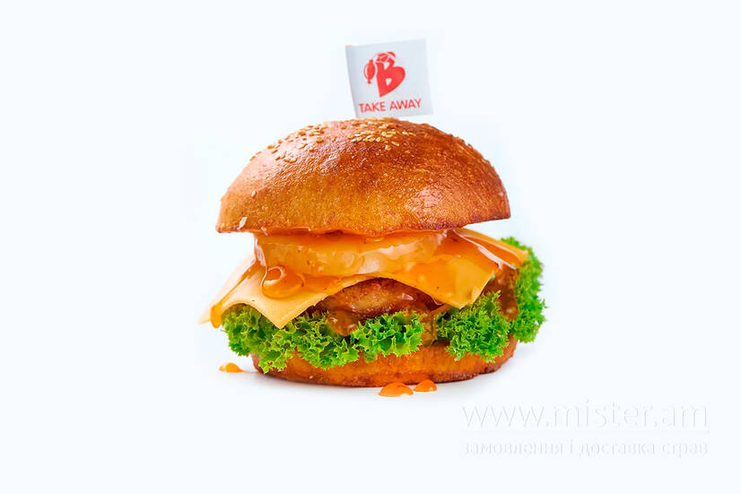Куряча котлета, салат айсберг, ананас консервований, червона цибуля, сир тостовий, кисло-солодкий соус.