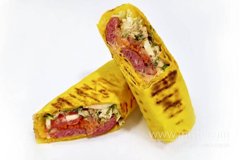Лаваш, сосиска на вибір молочна або баварська, пекінська капуста, морква по-корейськи, томати, фірмовий соус, зелень.