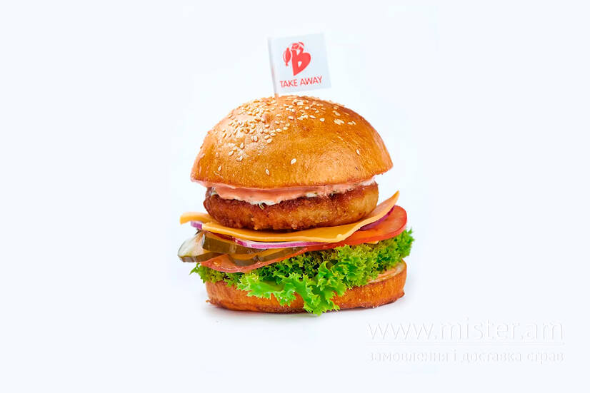 Свиняча котлета, салат айсберг, помідор, огірок мариновий, червона цибуля, сир тостовий, фірмовий соус.