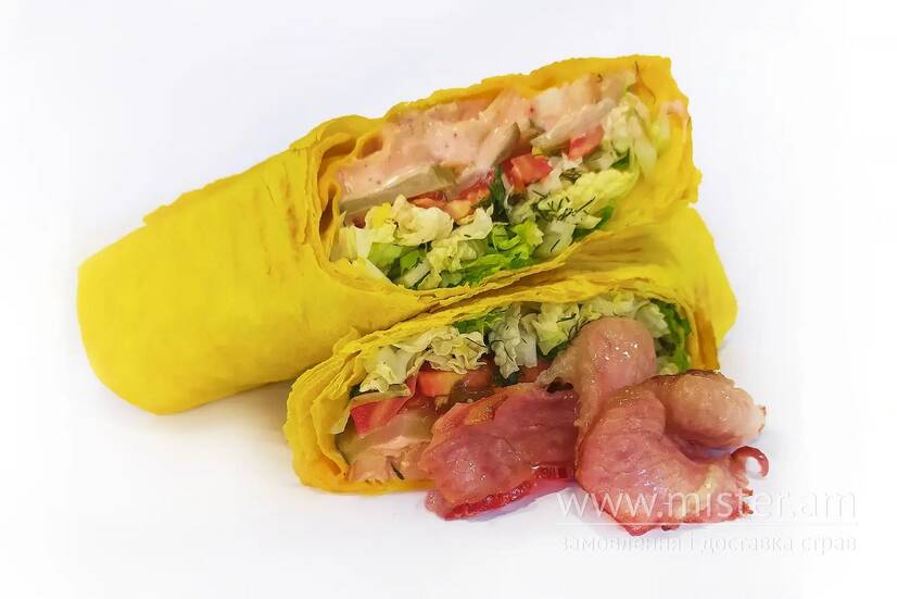Лаваш, курка, бекон, пекінська капуста, томати, огірок маринований, фірмовий соус, зелень.