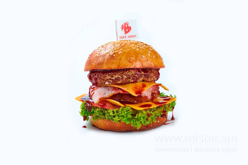 Котлети на вибір куряча, свиняча, яловича, салат айсберг, помідор, червона цибуля,бекон, сир тостовий, соус на вибір барбекю або фірмовий.