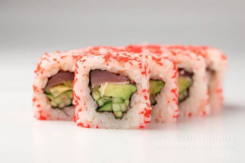 Авокадо, огірок, тунец, майонез, ікра тобіка.