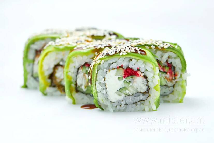 Вугор, авокадо, огірок, ікра тобіка, сир вершковий, соус унагі, кунжут.